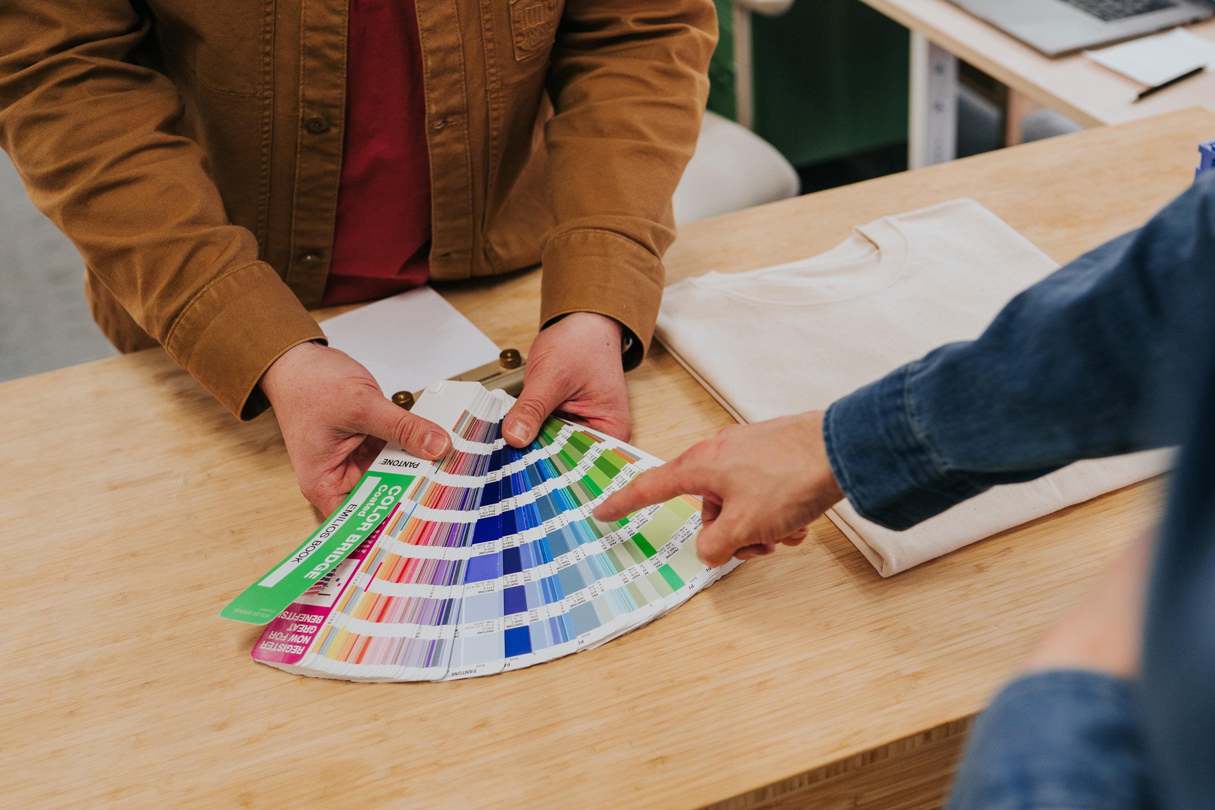 Inte längre! Vi har ett öppet showroom där vem som helst kan titta förbi för att se vårt sortiment och prova våra plagg. Du kan också prata med oss direkt för att få feedback eller ställa frågor – det är därför vi finns här! Vi har dessutom en öppen produktion, så du kan faktiskt se oss trycka beställningar live (om du någonsin varit nyfiken på hur det går till).